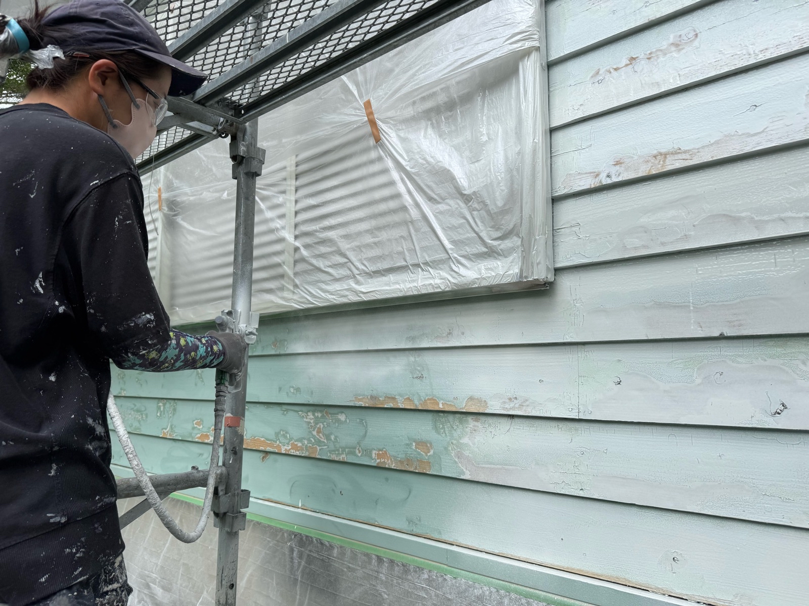 さて、これは外壁の下塗りです。 吹付で仕上げていきます。